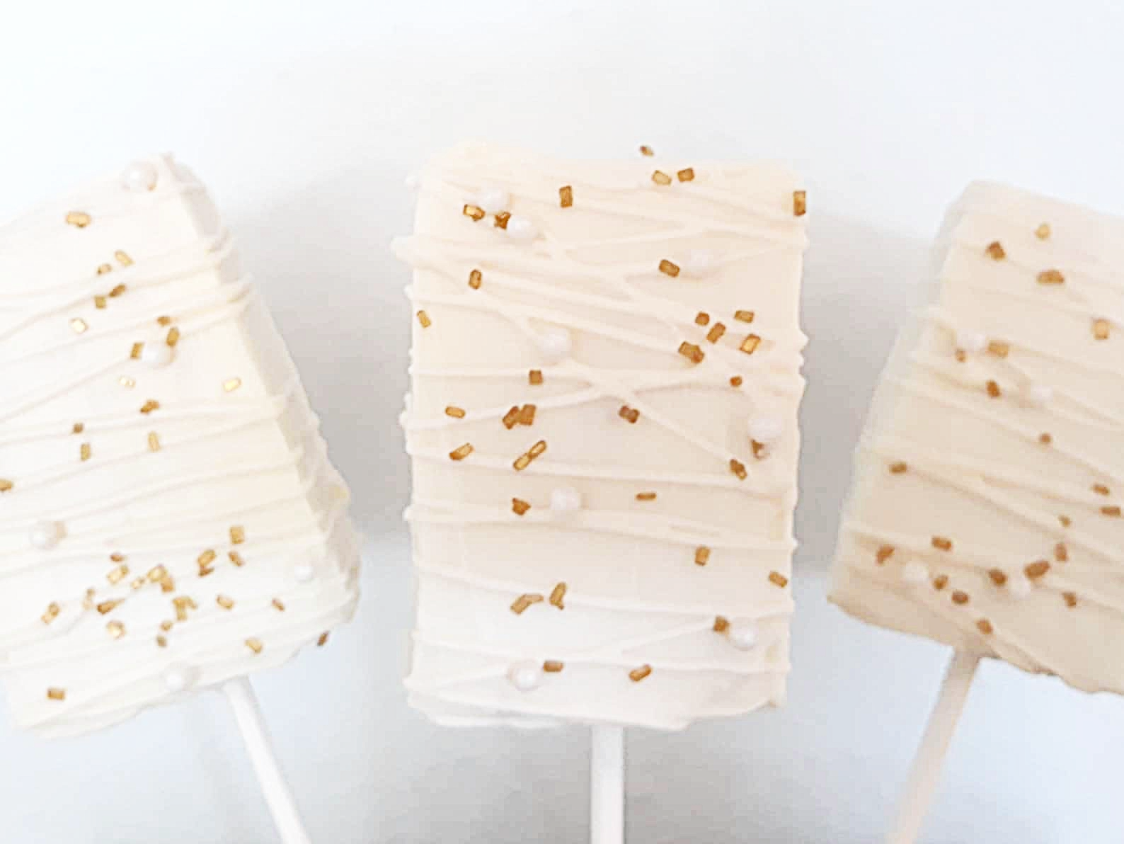 Marshmallow Crispy Treats on sticks, dipped in chocolate or white chocolate with drizzle. Box of 9 or 18Β 2″ X 3″ ea.Β